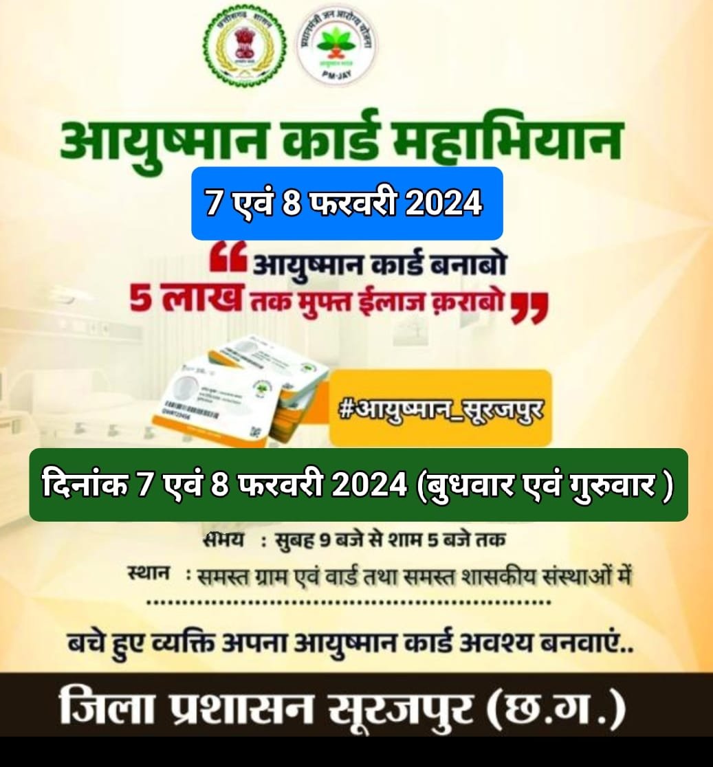 सूरजपुर/ आयुष्मान भारत योजना के तहत अधिकाधिक लोगों को लाभ के लिए पात्रों को पांच लाख रुपये तक का निःशुल्क उपचार देने के लिए महाभियान चलाकर आयुष्मान कार्ड बनाये जा…
