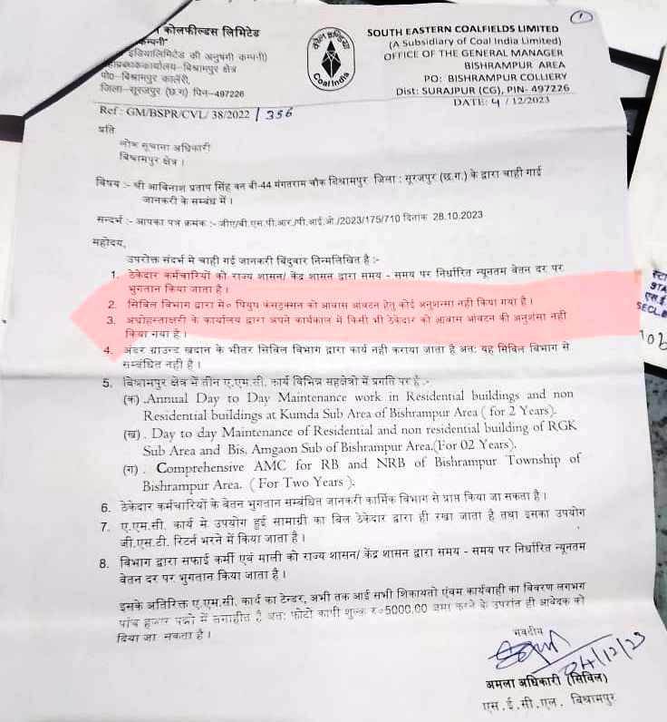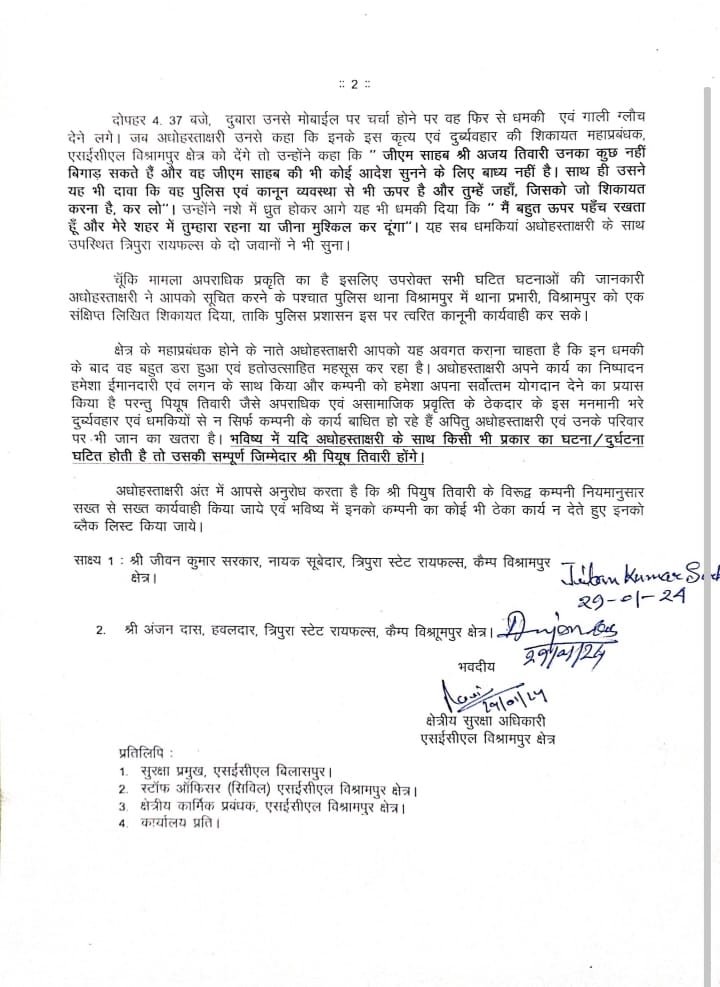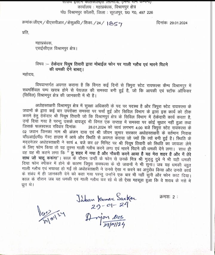 और अधिकारी का फोन स्पीकर पे ऑन होने के कारण वहां बैठे दो त्रिपुरा राइफल कर्मचारी ने भी सुना कि किस तरीके से एक ठेकेदार गुंडागर्दी दिखाते हुए अधिकारी के ऊपर अपना धौंस जमा रहा है वही इस ठेकेदार की मनमानी चरम सीमा पर है कई बार क्षेत्र के लोगों ने इसकी शिकायत लिखित में विजिलेंस से लेकर एसईसीएल में अधिकारियों को भी दी है ।