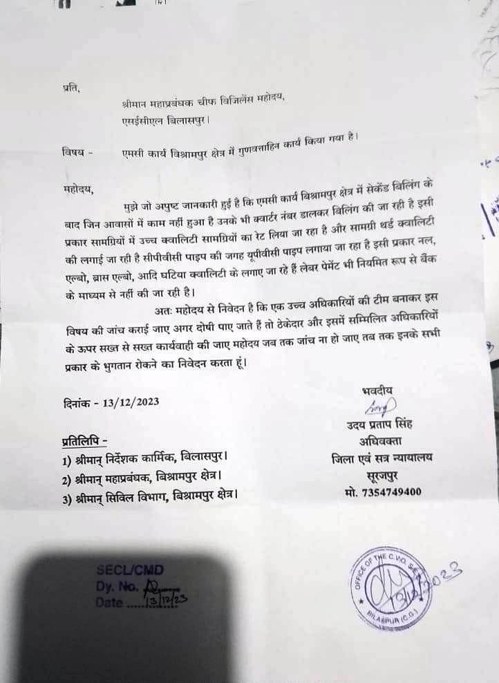 लेकिन आज तक कुछ अधिकारी के साथ मिलीभगत होने के कारण इसके ऊपर कोई कारवाई नहीं हुआ वहीं इसकी शिकायत रवि कुमार क्षेत्रीय सुरक्षा अधिकारी के द्वारा विश्रामपुर थाना से लेकर sp सूरजपुर और महाप्रबंधक एसईसीएल विश्रामपुर को दी गई गई है।