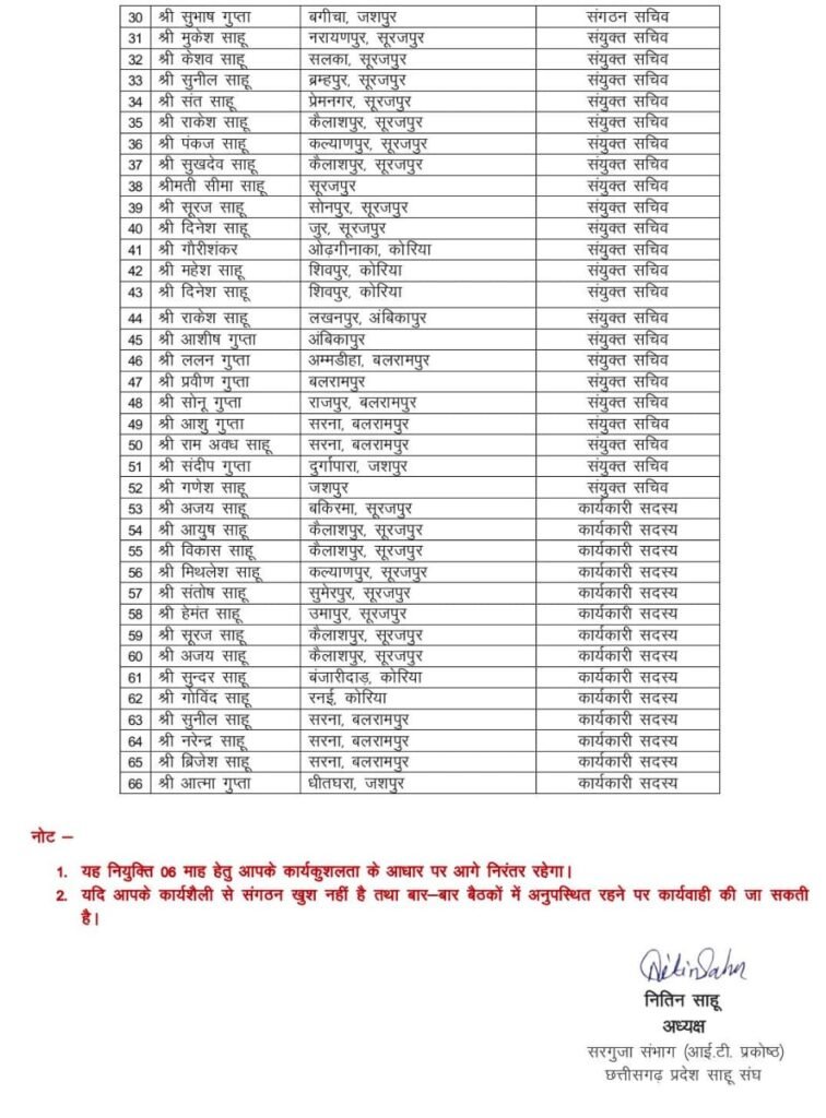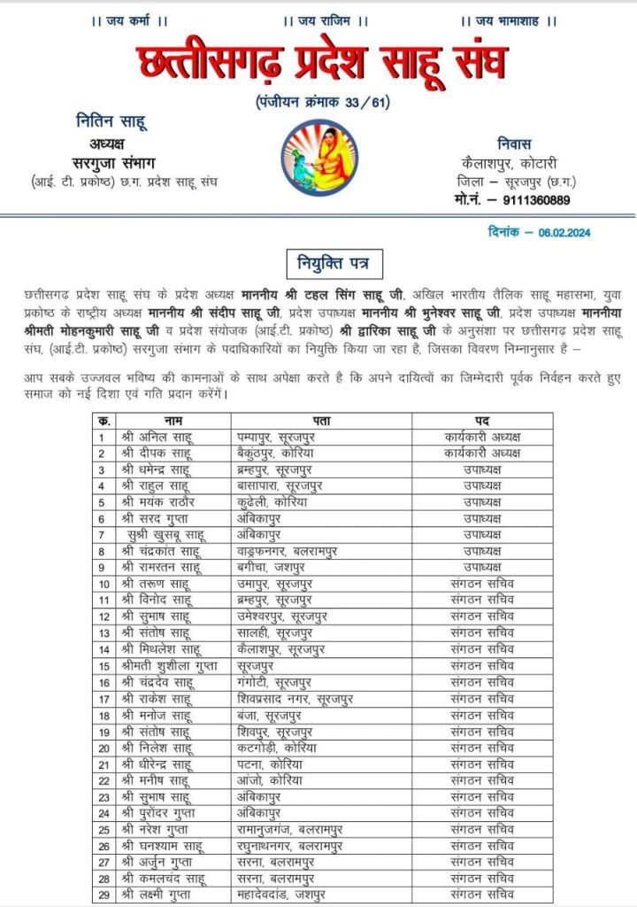 छत्तीसगढ़ प्रदेश साहू संघ (आई. टी. प्रकोष्ठ) सरगुजा संभाग ने अपने प्रथम कार्यकारणी का विस्तार किया है। जिसमें साहू समाज के 66 पदाधिकारियों की नियुक्ति संभाग स्तर पर किया गया है। छत्तीसगढ़ प्रदेश साहू संघ के प्रदेश अध्यक्ष टहल सिंह साहू, कसडोल विधायक व अखिल भारतीय तैलिक साहू महासभा (युवा प्रकोष्ठ) राष्ट्रीय अध्यक्ष संदीप साहू, प्रदेश उपाध्यक्ष भुवनेश्वर साहू, प्रदेश उपाध्यक्षा मोहन कुमारी साहू व आई. टी. प्रकोष्ठ के प्रदेश संयोजक द्वारिका साहू के अनुशंसा से, सरगुजा संभाग अध्यक्ष नितिन कुमार साहू नें पदाधिकारियों की नियुक्ति की है।