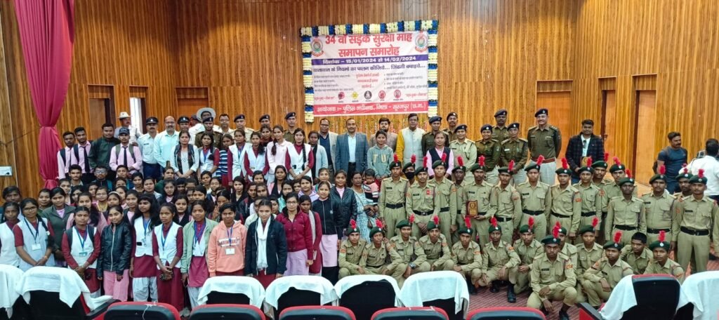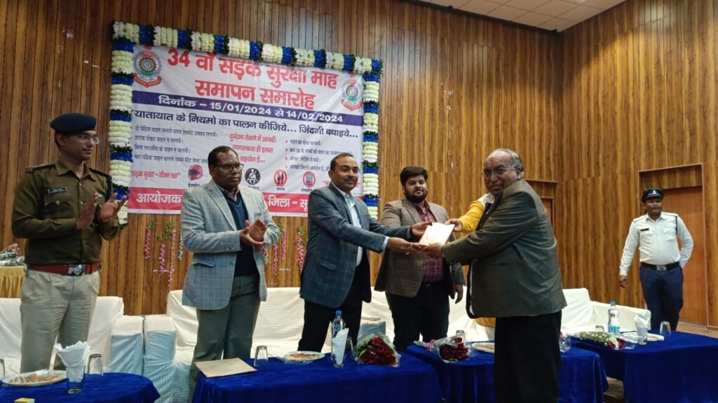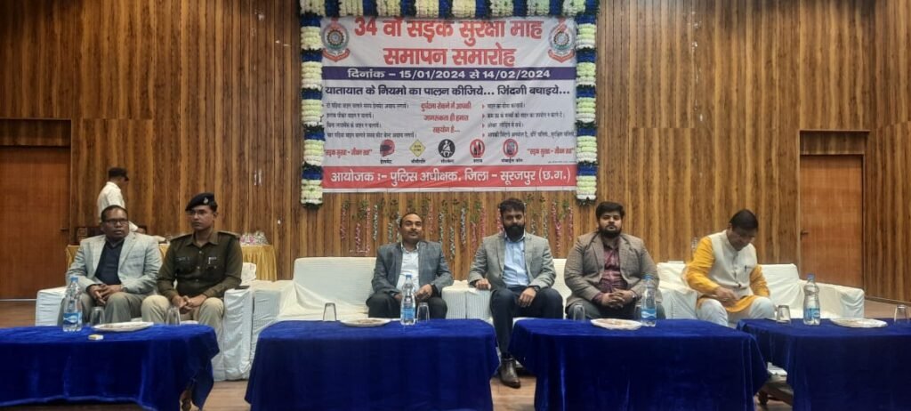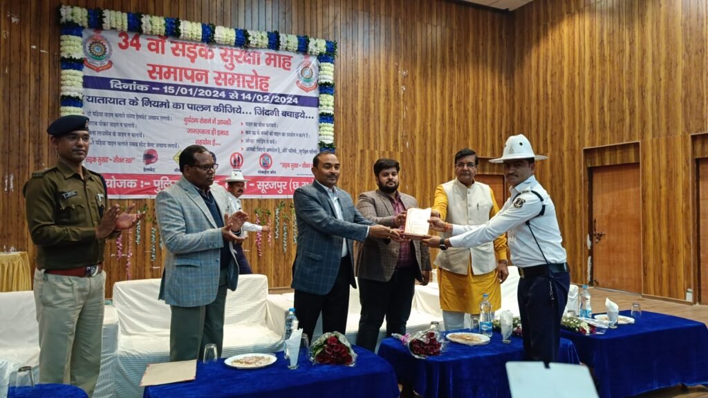 सूरजपुर। राष्ट्रीय सड़क सुरक्षा माह के समापन अवसर पर गुरूवार को ऑडिटोरियम भवन में भव्य आयोजन हुआ। इस मौके पर मुख्य अतिथियों ने गुड सेमेरिटन को सम्मानित कर यातायात व्यवस्था में उत्कृष्ट कार्य करने वाले पुलिस जवानों की हौसला अफजाई कर स्मृति चिन्ह प्रदान किया। पूरे देश में 1 माह से चल रहे यातायात सड़क सुरक्षा माह का आज समापन किया गया। आपको बता दे कि कलेक्टर सूरजपुर श्री रोहित ब्यास, वरिष्ठ पुलिस अधीक्षक श्री एम.आर.आहिरे, डीएफओ श्री पंकज कमल, भाजपा जिलाध्यक्ष श्री बाबुलाल अग्रवाल व सीएचएमओ डॉ. आर.एस.सिंह के मुख्य आतिथ्य में जिले में आयोजित 34वां राष्ट्रीय यातायात सड़क सुरक्षा माह 2024 का समापन हुआ।