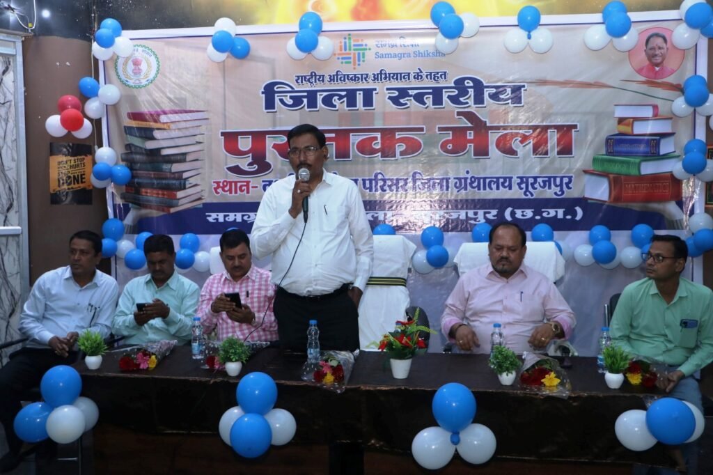 सूरजपुर/ कलेक्टर श्री रोहित व्यास के मार्गदर्शन में राष्ट्रीय आविष्कार अभियान के तहत जिला स्तरीय पुस्तक मेला का आयोजन तक्षशीला मेधा ग्रंथलाय सूरजपुर में जिले के सभी विकासखण्ड से चयनित विद्यालय के बच्चों के द्वारा किया गया है। पुस्तक मेला में सेजेस नवापारा, सेजेस बतरा,सेजेस भुवनेश्वरपुर, सेजेस ओड़गी, सेजेस प्रतापपुर के प्राथमिक एवं माध्यमिक स्तर के बच्चों ने विभिन्न थीम को लेकर जैसे (गणित का जादू, पुस्तक हमारे मित्र, पुस्तक तब और अब इत्यादि )बुक स्टॉल लगाया गया।