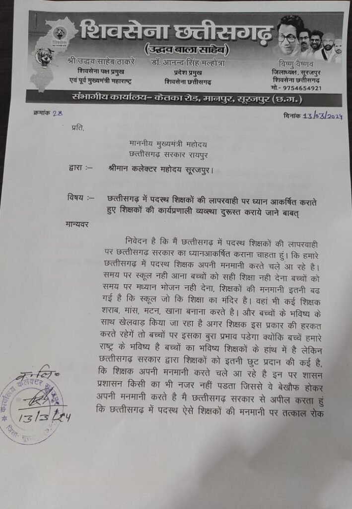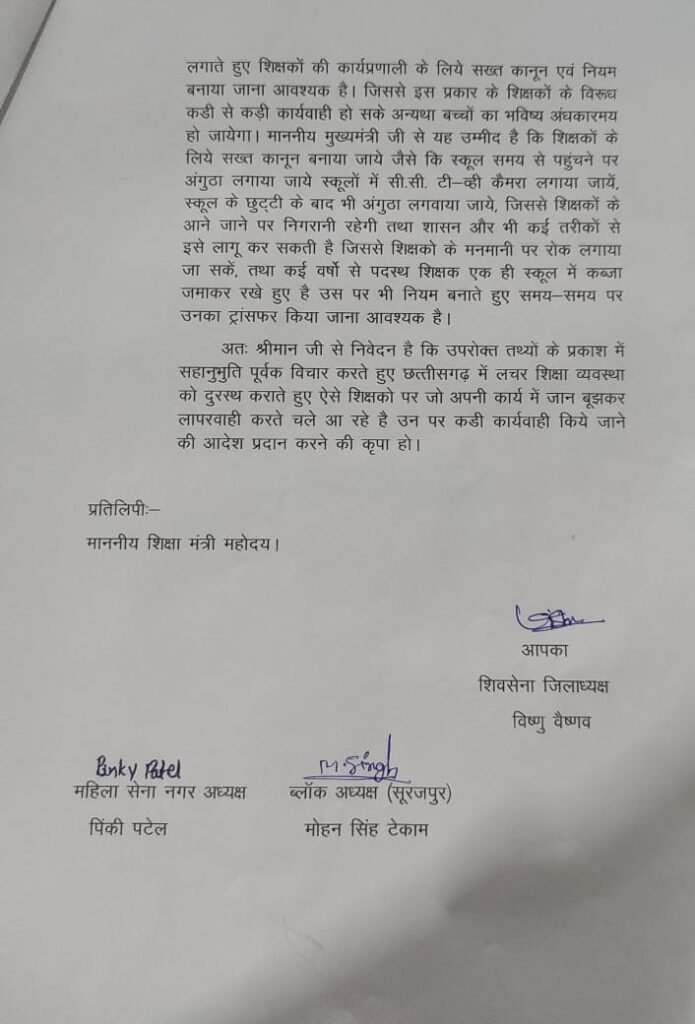 शिवसेना जिला प्रमुख श्री विष्णु वैष्णव ने ज्ञापन के माध्यम से छत्तीसगढ़ में पदस्थ शिक्षकों की लापरवाही पर छत्तीसगढ़ सरकार का ध्यानआकर्षित ज्ञापन के माध्यम से कराया है