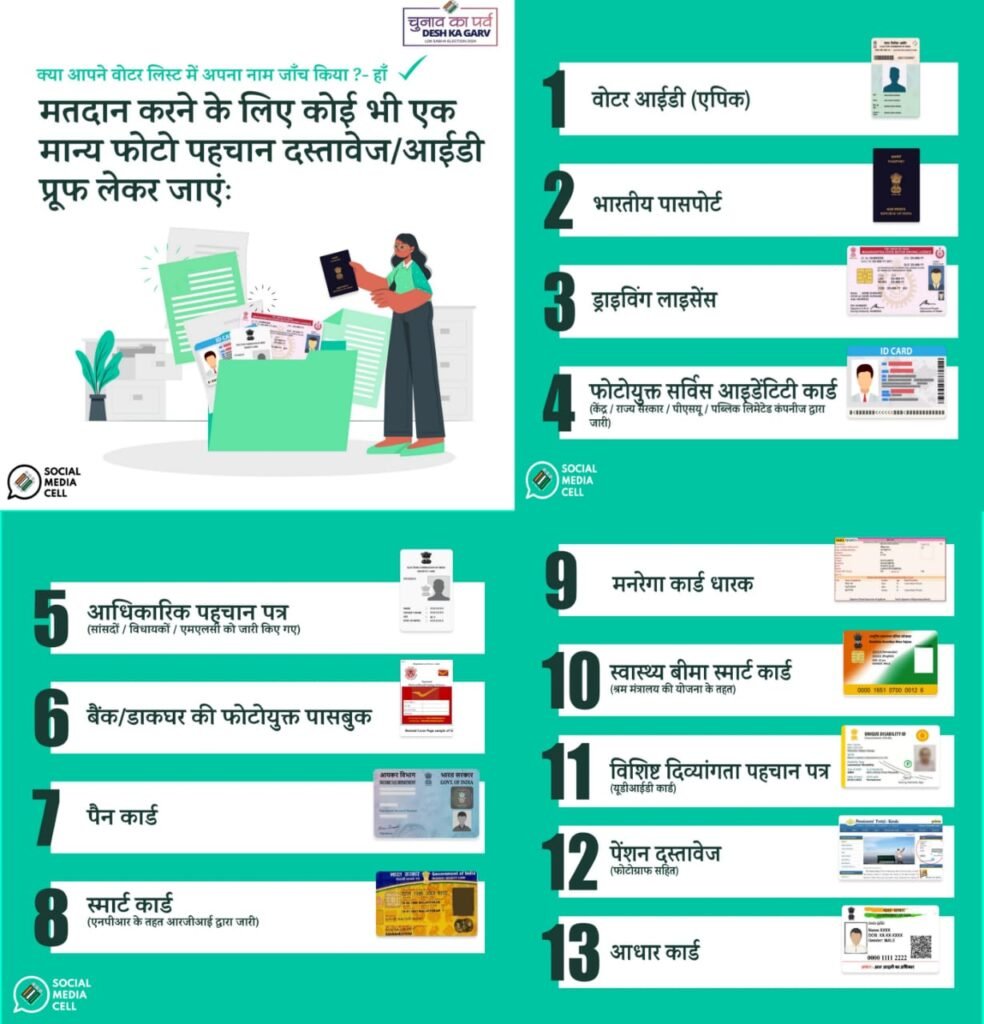 मतदाता को अपनी पहचान के लिए पासपोर्ट, ड्राइविंग लाइसेंस, राज्य या केंद्र सरकार, सार्वजनिक क्षेत्र के उपक्रमों, पब्लिक लिमिटेड कंपनियों की ओर से अपने कर्मचारियों को जारी किए गए फोटोयुक्त सेवा पहचान पत्र, बैंकों या डाकघरों की ओर से जारी की गई फोटोयुक्त पासबुक, पेन कार्ड, आरजीआई एवं एनपीआर द्वारा जारी किए गए स्मार्ट कार्ड, मनरेगा जॉब कार्ड, श्रम मंत्रालय की योजना द्वारा जारी स्वास्थ्य बीमा स्मार्ट कार्ड, फोटोयुक्त पेंशन दस्तावेज, निर्वाचन तंत्र द्वारा जारी फोटो मतदाता पर्ची व आधार कार्ड दिखाने होंगे।
