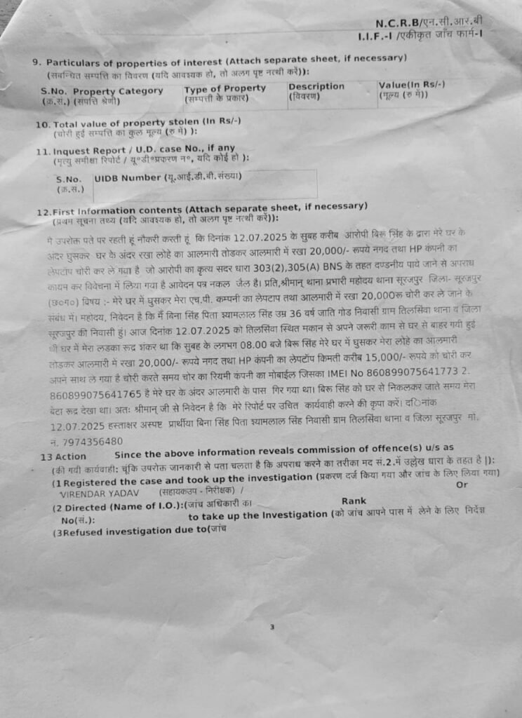 इसके बाद सुबह जब पुलिसकर्मी घर पर नहीं थी, उसी दौरान घर में सो रहे बच्चे को डरा-धमकाकर के घर के भीतर घुसकर अलमारी को तोड़ा और उसमें रखे करीब 20,000 नकद और एक लैपटॉप लेकर फरार हो गया,चोरी करते समय चोर का रियलमी कंपनी का मोबाइल आलमारी के पास गिर गया था। जिसे पुलिस वालों ने जप्ती कर लिया है। महिला पुलिसकर्मी ने थाने में शिकायत कर बताया कि बीती रात भी वही संदिग्ध युवक उनके घर के सामने आकर जमकर गाली-गलौज कर तोड़फोड़ कर रहा था और सुबह घर में चोरी की वारदात को अंजाम दे दिया