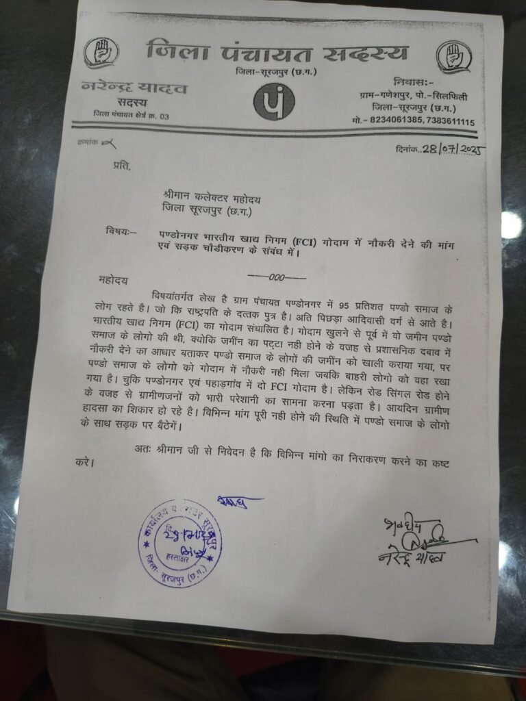 सूरजपुर – जिला पंचायत सदस्य नरेंद्र यादव के नेतृत्व में पण्डो जनजाति बाहुल्य ग्राम पंचायत पण्डोनगर के ग्रामीणों ने कलेक्टर महोदय, सूरजपुर को ज्ञापन सौंपकर बेयर हाऊस के गोदाम में नौकरी और सड़क चौड़ीकरण की मांग उठाई है। ग्रामीणों का कहना है कि उनकी मांगें पूरी न होने पर वे सड़क पर आंदोलन करने को मजबूर होंगे।