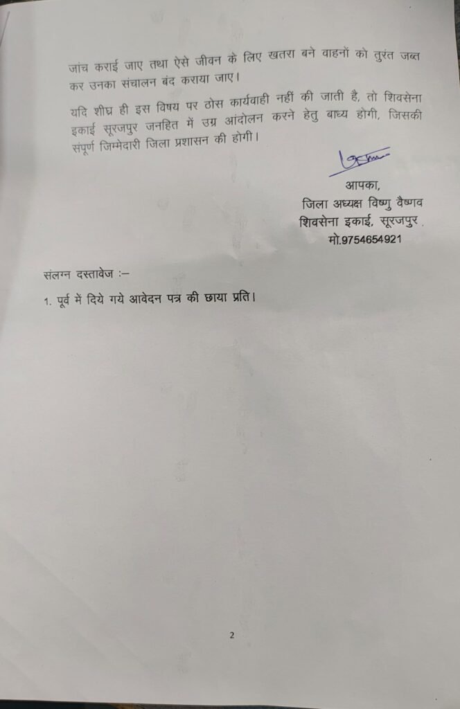 शिवसेना पदाधिकारियों ने कहा कि जिला प्रशासन यदि तत्काल कार्रवाई नहीं करती है तो शिवसेना इकाई सूरजपुर सड़क पर उतरकर उग्र आंदोलन करने को विवश होगी। उन्होंने स्पष्ट कहा कि यात्रियों की जान से खिलवाड़ बर्दाश्त नहीं किया जाएगा।