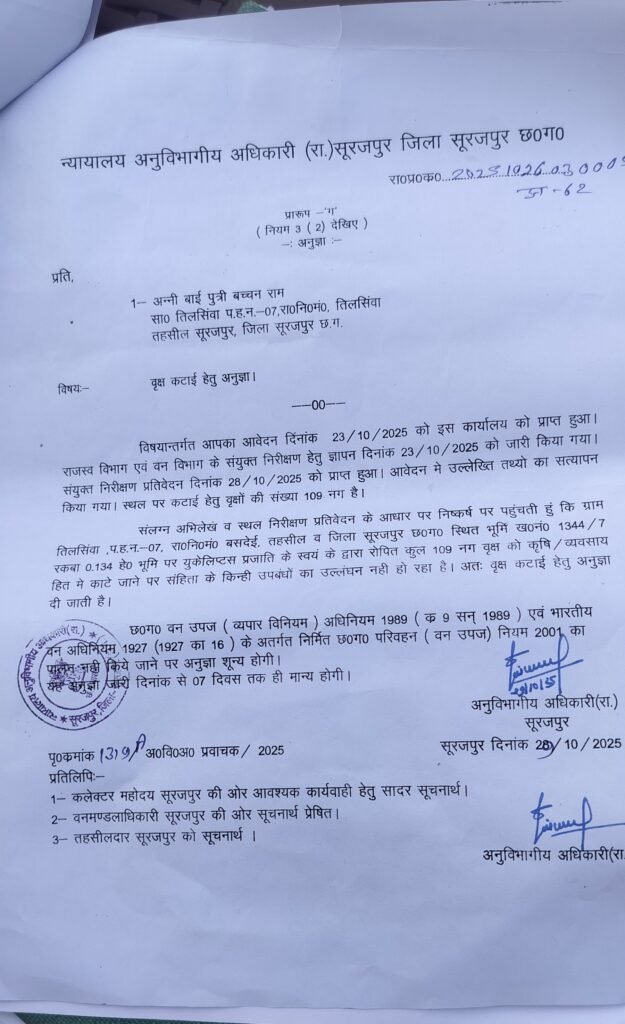 इसी दौरान यह खुलासा हुआ कि अनी बाई, निवासी ग्राम तिलसिवा, को उसी दिन यानी 29 अक्टूबर को ही 109 पेड़ों की कटाई की अनुमति एसडीएम कार्यालय सूरजपुर से जारी की गई थी — जबकि लकड़ी की कटाई और लोडिंग पहले ही हो चुकी थी। इससे यह स्पष्ट संकेत मिलता है कि लकड़ी माफियाओं और राजस्व विभाग के बीच किसी स्तर पर मिलीभगत हो सकती है।