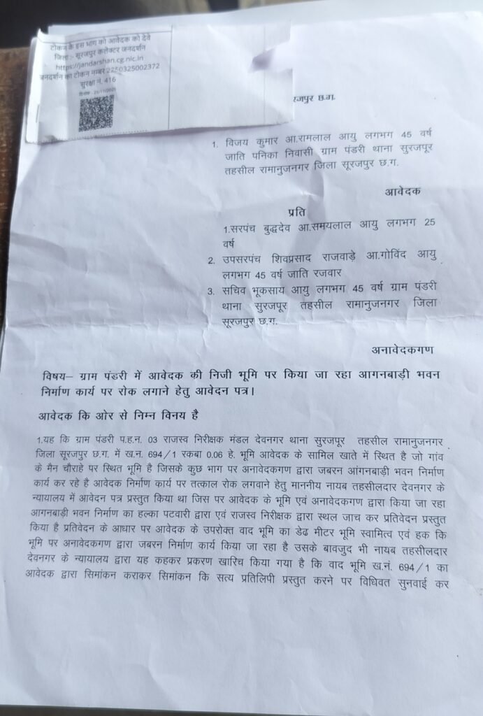 आवेदन पत्र के अनुसार ग्राम पंडरी स्थित खसरा नंबर 694/1, रकबा 0.06 हेक्टेयर भूमि आवेदक के स्वामित्व एवं कब्जे में है। इसके बावजूद ग्राम पंचायत के कुछ पदाधिकारियों द्वारा उक्त भूमि पर जनरल आंगनबाड़ी भवन का निर्माण शुरू कर दिया गया है। आवेदक ने आरोप लगाया कि निर्माण कार्य से उनकी भूमि पर अधिकार प्रभावित हो रहा है और यदि समय रहते कार्रवाई नहीं की गई तो भविष्य में उनकी जमीन पर स्थायी कब्जे जैसी स्थिति बन सकती है।