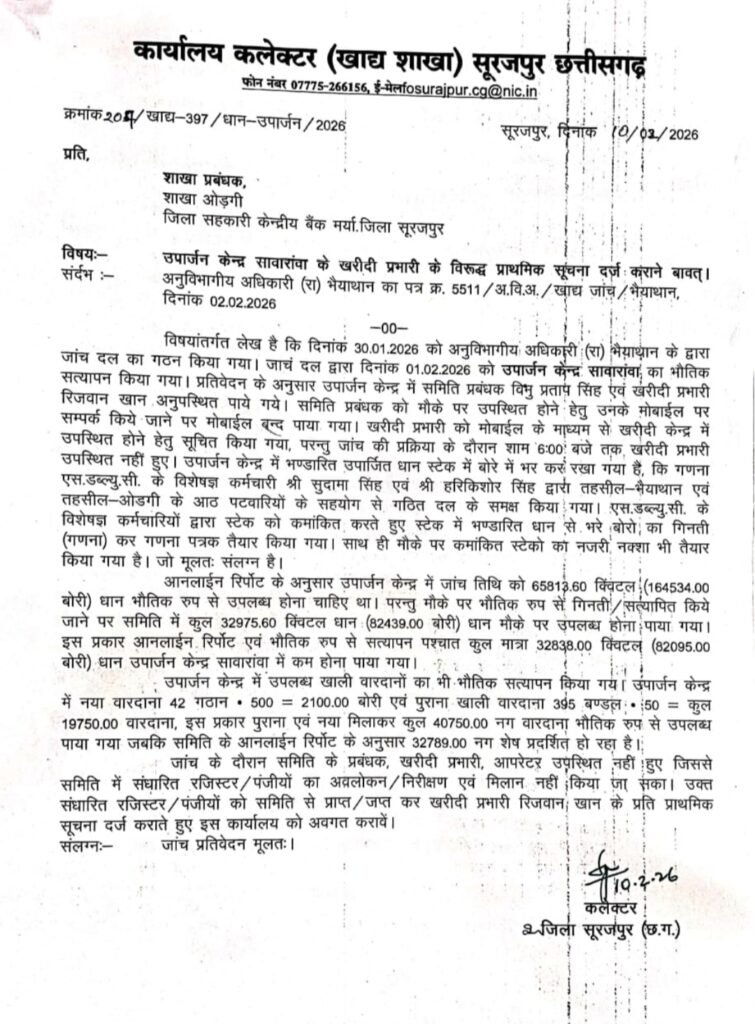 धान खरीदी सत्र 2025–26 में सामने आए इस बहुचर्चित मामले में 32,838 क्विंटल धान की कमी का खुलासा हुआ।