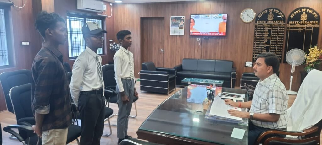 सूरजपुर। लोगों को यातायात सुरक्षा के प्रति जागरूक करने पुलिस की मुहिम में स्कूली छात्र खुद भी आगे आने लगे है। गुरूवार को नगर में स्थित एक विद्यालय के छात्र जिला पुलिस कार्यालय पहुंचे और पुलिस अधीक्षक सूरजपुर श्री रामकृष्ण साहू (भा.पु.से.) से मुलाकात कर यातायात नियमों के प्रति चलाए जा रहे जागरूकता कार्यक्रम में पुलिस को सहयोग करने की दिशा में कार्य करने की मंशा जाहिर किया। सूरजपुर स्थित शासकीय बालक उच्चतर माध्यमिक विद्यालय के छात्र जगदीश राजवाड़े, संजीत टोप्पो व आशीष कमरो ने आमजनों को यातायात के नियमों के प्रति जागरूकता के इस पुनित कार्य में सहयोग देने की बात कही। इस दौरान पुलिस अधीक्षक ने यातायात नियमों के प्रति जागरूकता के कार्यो में खुद से आगे आकर सहयोग करने की बात पर प्रसन्नता व्यक्त करते हुए छात्रों को कहा कि हम सभी का कर्तव्य है कि अधिक से अधिक लोगों को यातायात नियमों की जानकारी देकर उन्हें जागरूक बनाए, जीवन को सुरक्षित रखने के लिए यातायात के नियमों का पालन करना जरूरी है। सुरक्षित जीवन के लिए सुरक्षित यात्रा आवश्यक है। यातायात नियम समाज हित में हैं।
