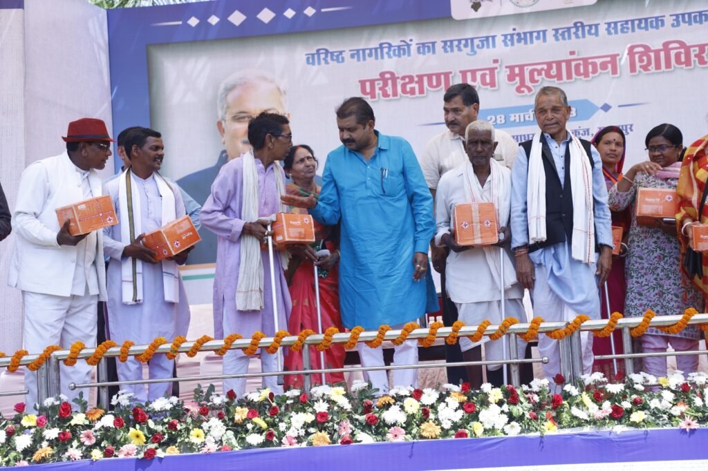 सूरजपुर/ वरिष्ठ नागरिकों एवं वृद्धजनों को होने वाली शारीरिक समस्याओं का निराकरण करने हेतु संभाग स्तरीय जिला- मनेन्द्रगढ़, भरतपुर, चिरमिरी, कोरिया, सूरजपुर, सरगुजा, बलरामपुर एवं जशपुर को सम्मिलित कर समस्त जिलों वरिष्ठ नागरिकों को उनके आवश्यकतानुसार छड़ी, चश्मा, कृत्रिम दांत(डेन्चर) व्हील चेयर आदि के लिए परीक्षण हेतु मूल्यांकन एवं वितरण समारोह का आयोजन आज नगर के साधूराम सेवाकुंज में किया गया। कार्यक्रम में नगरपालिका अध्यक्ष श्री के.के. अग्रवाल, नगर पंचायत जरही अध्यक्ष श्री बिजू दासन, श्री कुलदीप बिहारी जिला सदस्य, श्रीमती मंजू संतोष मिन्ज जिला पंचायत सदस्य, श्रीमती कुसुमलता राजवाड़े पार्षद सूरजपुर, श्रीमती निशा बिजू दासन पार्षद जरही, श्रीमती आंनद कुंवर जिलाअध्यक्ष ग्रामीण, श्रीमती दिप्ती स्वाई महिला जिलाध्यक्ष शहरी, श्रीमती विमला सरपंच, कमला यादव एल्डरमैन, बाबूलाल राजवाड़े जनपद सदस्य, डिप्टी कलेक्टर सुश्री वर्षा बंसल सहित मंच पर उपस्थित वरिष्ठ नागरिक जगमोहन ने छत्तीसगढ़ महतारी के छायात्रित पर माल्यार्पण कर तथा सभी ने दीप प्रज्ज्वलन कर कार्यक्रम का शुभारंभ किया। उप संचालक समाज कल्याण सूरजपुर श्रीमती बेनेदिक्ता तिर्की ने मंचासीन अतिथियों का परिचय कराया तथा पुष्पगुच्छ देकर सबका स्वागत किया।