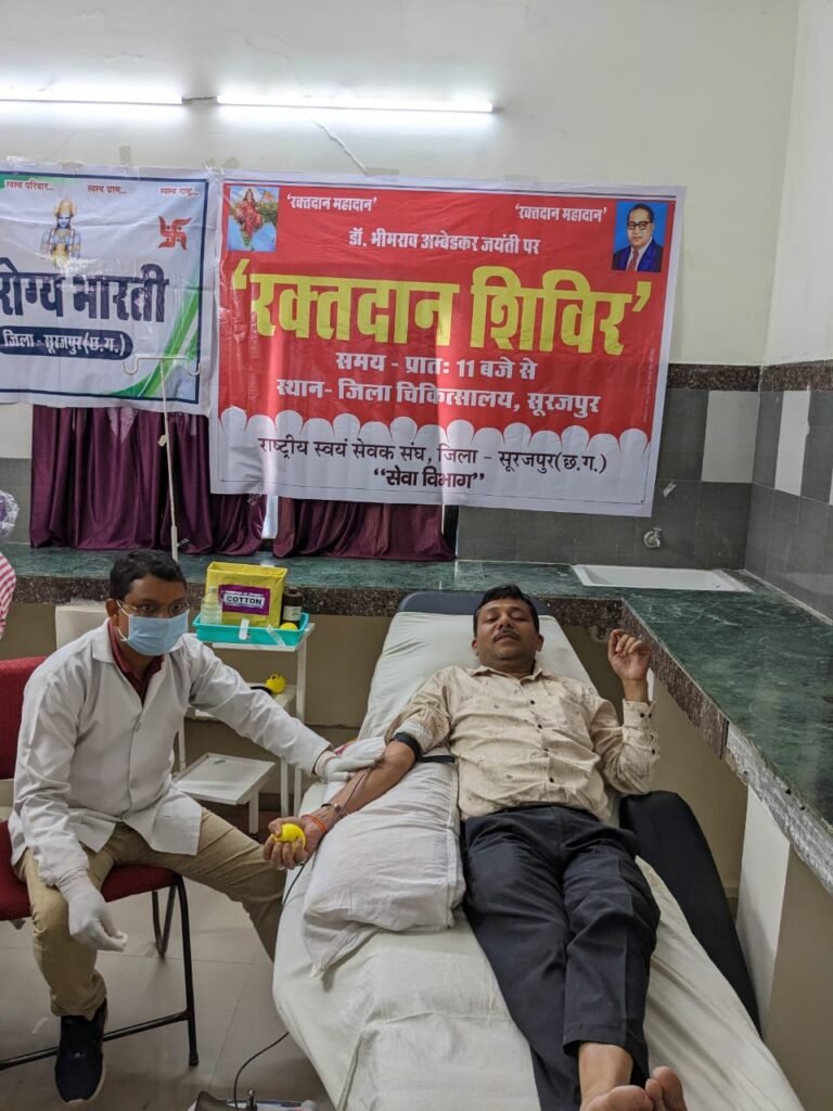राष्ट्रीय स्वयंसेवक संघ जिला सूरजपुर के सेवा विभाग द्वारा डॉक्टर भीमराव अंबेडकर जयंती के उपलक्ष्य में जिला चिकित्सालय सूरजपुर में रक्तदान शिविर का आयोजन किया गया, जिसमें जिले के विभिन्न स्थानों से आए हुए स्वयंसेवकों ने स्वप्रेरणा से रक्तदान किया। रक्तदान शिविर के बारे में जानकारी देते हुए विभाग सेवा प्रमुख श्री कृष्णकांत मिश्रा जी ने बताया .