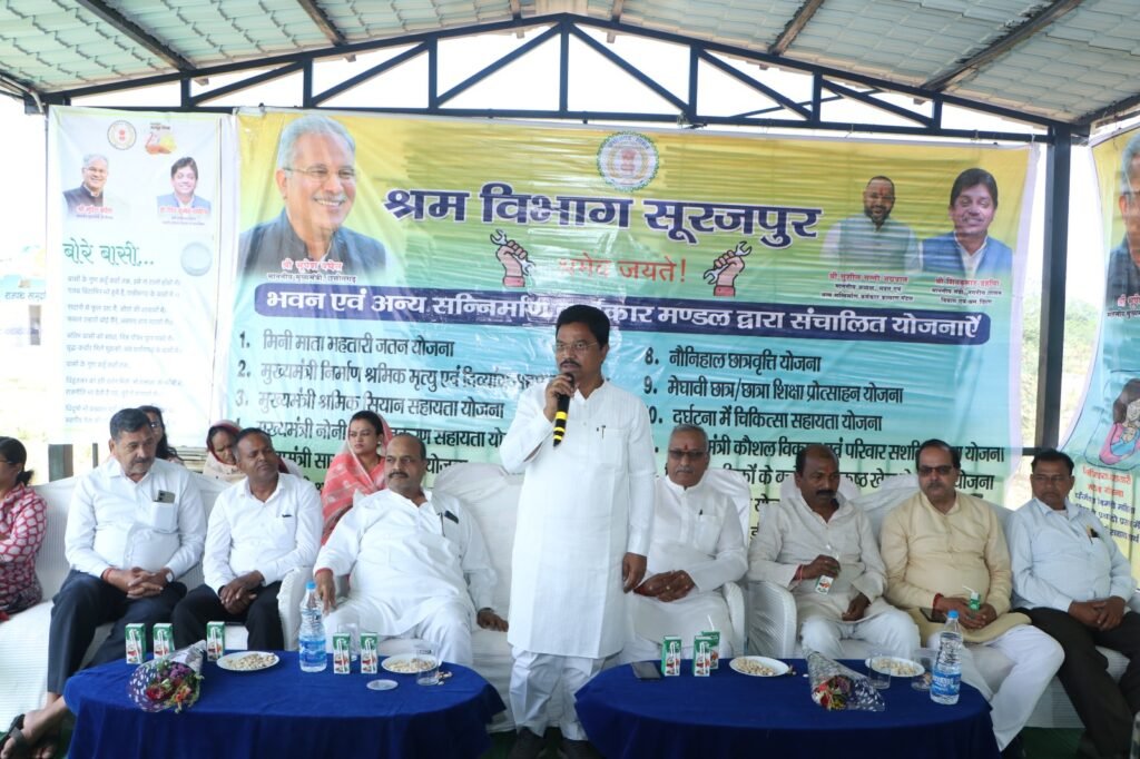 सूरजपुर/ अंतर्राष्ट्रीय श्रमिक दिवस के अवसर पर जिला मुख्यालय में स्थित गढ़कलेवा में श्रमिक सम्मेलन एवं बोरे बासी का आयोजन किया गया। श्रमिक दिवस पर श्रम विभाग अंतर्गत संचालित मेघावी छात्र-छात्राओं को शिक्षा प्रोत्साहन अंतर्गत नर्सिंग में अध्ययनरत 07 हितग्राहियों के बच्चों को कुल राशि 242500 रुपये का चेक मुख्य अतिथि भटगांव विधानसभा क्षेत्र के विधायक एवं संसदीय सचिव श्री पारस नाथ राजवाड़े के द्वारा प्रदाय किया गया। अतिथियों द्वारा श्रमिकों को फूल माला पहना कर सम्मान करते हुए बोरे बासी का कार्यक्रम शामिल होेने कहा गया।