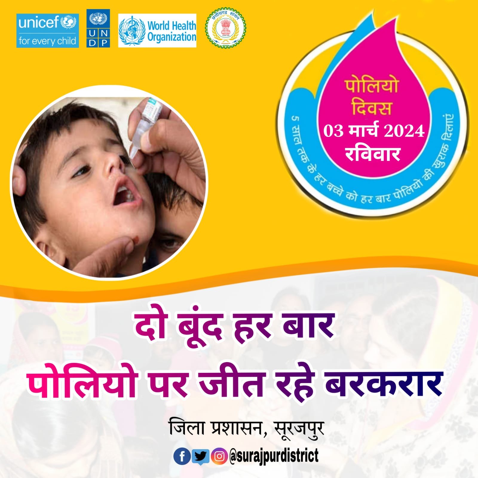 सूरजपुर/ जिले में राष्ट्रीय सघन पल्स पोलियो अभियान 2024 का आयोजन जिले में 03 मार्च 2024 को किया जा रहा है। जिसमें 03 मार्च 2024 को बूथ पर तथा 04…